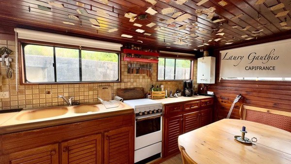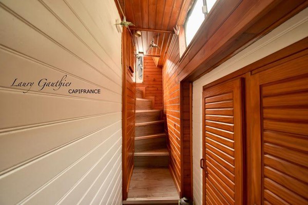 L’habitacle est partiellement enfoncé dans l’eau (assurant une température confortable en été) et a une hauteur sous barrot d’environ 2m. On y trouve un long couloir, desservant :